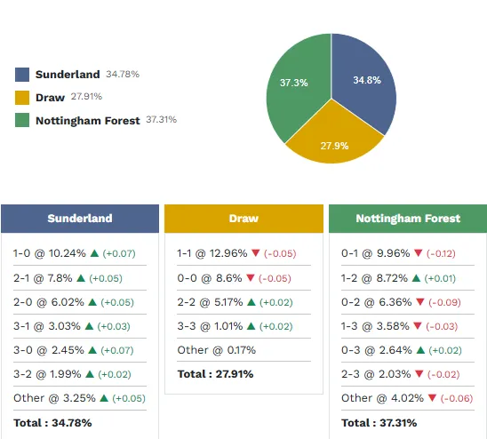 Trong đó, Sunderland thắng với tỷ số 1-0 được kỳ vọng xảy ra với 10.24%. Được biết, tỷ số hòa 1-1 cũng dễ xảy ra khi xác suất là 12.96%. Trong khi đó, Nottingham thắng với tỷ số 1-0 có tỷ lệ là 9.96%.