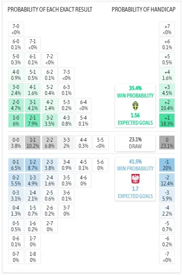 Trong nhóm các tỷ số có thể thắng của chủ nhà Thụy Điển, 2-1 có xác suất về lớn nhất với 7.9%. Tiếp theo đến 1-0 với 6% và 2-0 với 4.7%. Với Ba Lan, xác suất cao nhất của họ là thắng 2-1 với 8.7%.