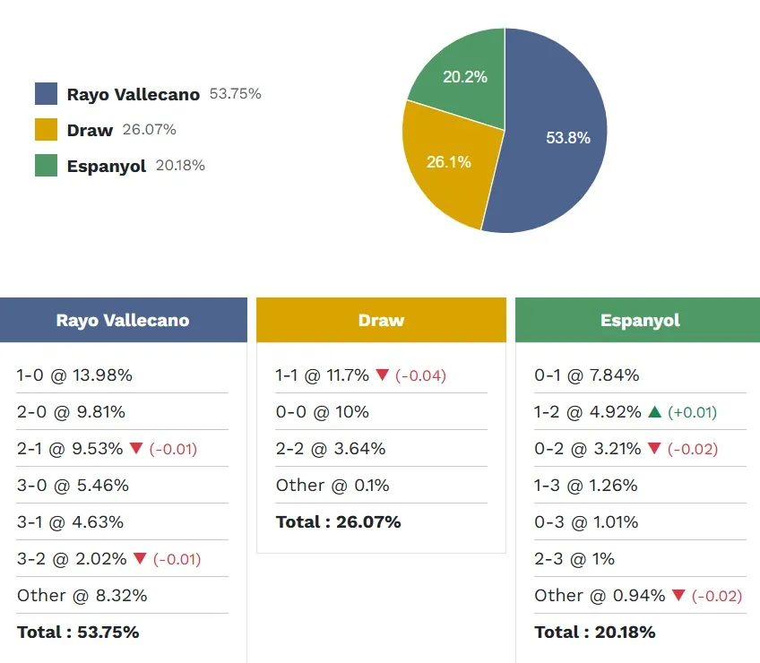 Tỷ số khả dĩ nhất để Vallecano thắng là 1-0 với xác suất 13,98%. Các tỷ số có khả năng xảy ra tiếp theo là 2-0 (9,81%) và 2-1 (9,53%). Tỷ số hòa có khả năng xảy ra nhất là 1-1 (11,7%), trong khi tỷ số cho chiến thắng của Espanyol là 1-0 (7,84%).