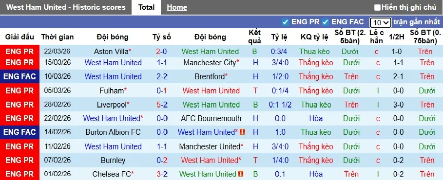 Thống kê phong độ 10 trận đấu gần nhất của West Ham