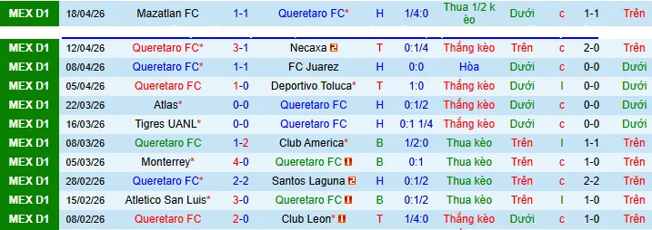 + Queretaro thắng 4 hòa 1 chỉ thua 1 trong 6 trận gần đây theo kèo châu Á.
