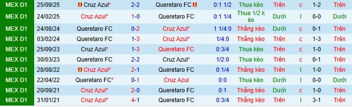 + Queretaro thắng 12 hòa 1 thua 7 trong 20 trận gần nhất trên sân nhà theo kèo châu Á.