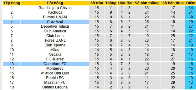 Cruz Azul đang có 29 điểm và xếp thứ 4, đã chắc chắn có suất play-off vì họ hơn đội thứ 9 tới 10 điểm.