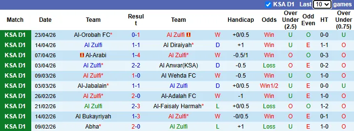 Thống kê phong độ 10 trận gần nhất của Al Zulfi