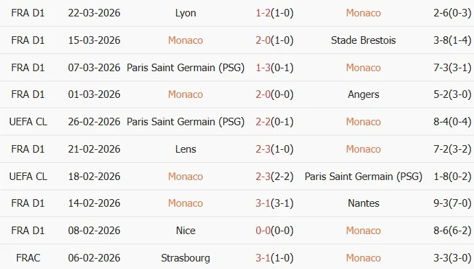 Thống kê phong độ 10 trận đấu gần nhất của AS Monaco