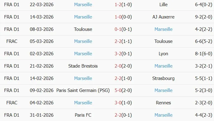 Thống kê phong độ 10 trận đấu gần nhất của Marseille