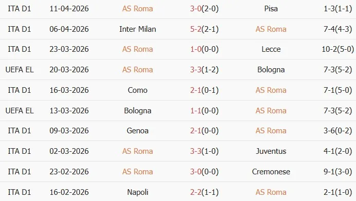 Thống kê phong độ 10 trận đấu gần nhất AS Roma