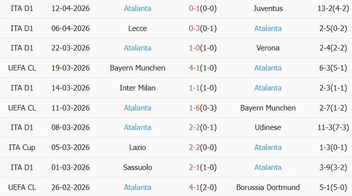 Thống kê phong độ 10 trận đấu gần nhất của Atalanta