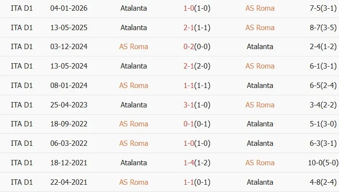 Lịch sử đối đầu AS Roma vs Atalanta