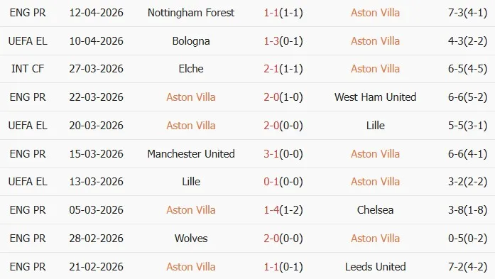 Thống kê phong độ 10 trận đấu gần nhất của Aston Villa