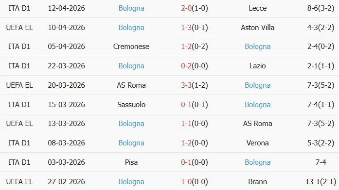 Thống kê phong độ 10 trận đấu gần nhất của Bologna