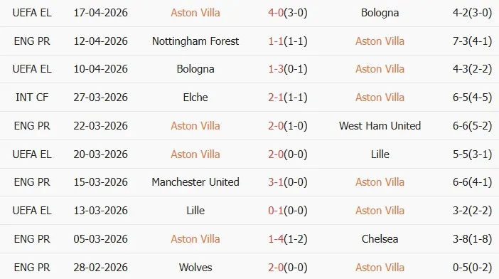 Thống kê phong độ 10 trận đấu gần nhất Aston Villa