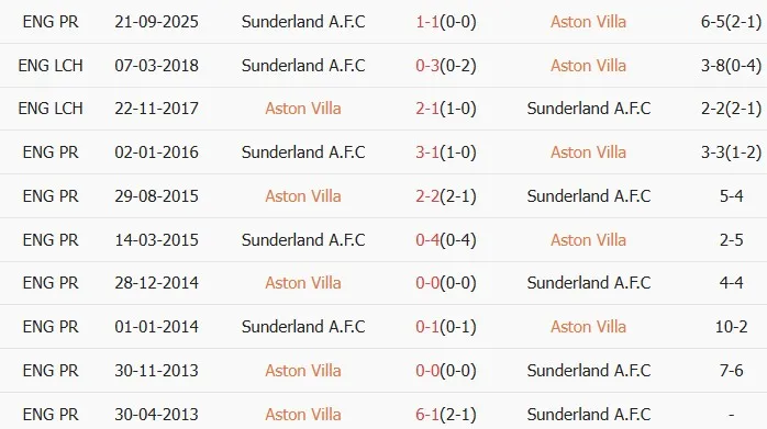 Thống kê phong độ, lịch sử đối đầu của Aston Villa vs Sunderland