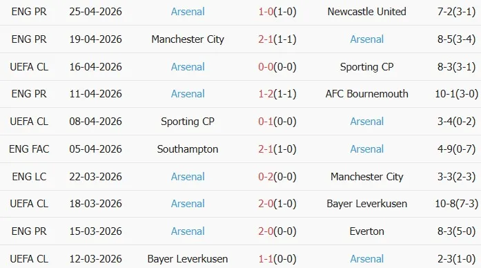 Thống kê phong độ 10 trận đấu gần nhất của Arsenal