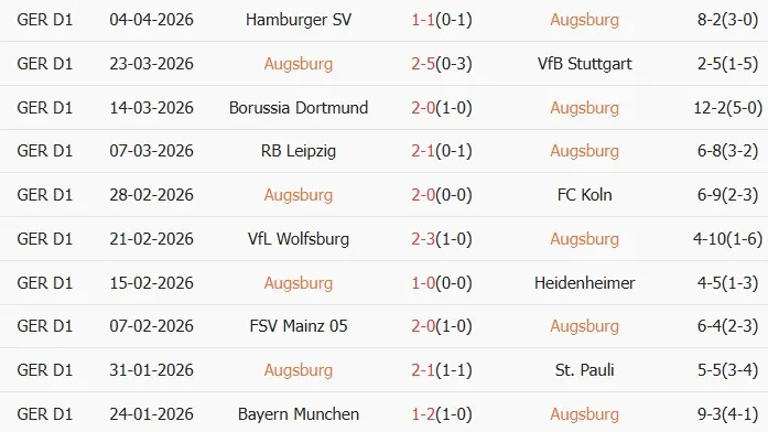 Thống kê phong độ 10 trận đấu gần nhất của Augsburg