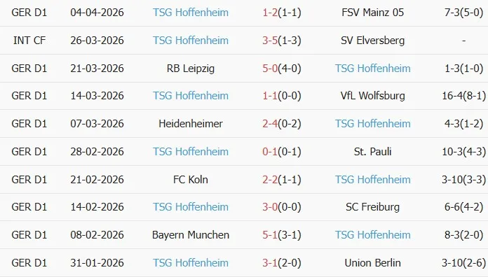 Thống kê phong độ 10 trận đấu gần nhất của Hoffenheim