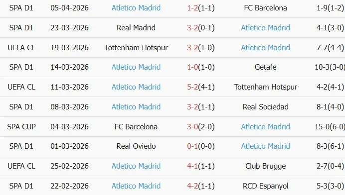 Thống kê phong độ 10 trận đấu gần nhất của Atletico Madrid cũng được cung cấp, giúp so sánh phong độ của hai đội.