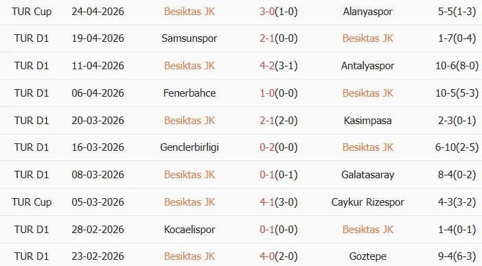Thống kê phong độ 10 trận đấu gần nhất của Besiktas