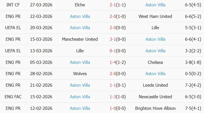 Thống kê phong độ 10 trận đấu gần nhất của Aston Villa