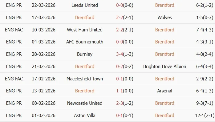 Thống kê phong độ 10 trận đấu gần nhất của Brentford