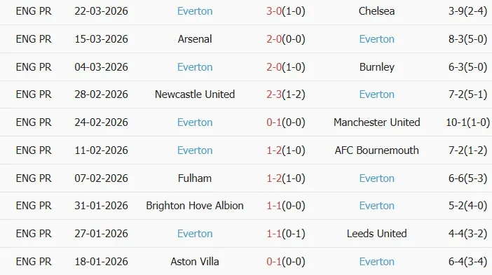 Thống kê phong độ 10 trận đấu gần nhất của Everton