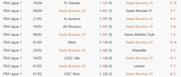 Thống kê phong độ 10 trận đấu gần nhất của Brest