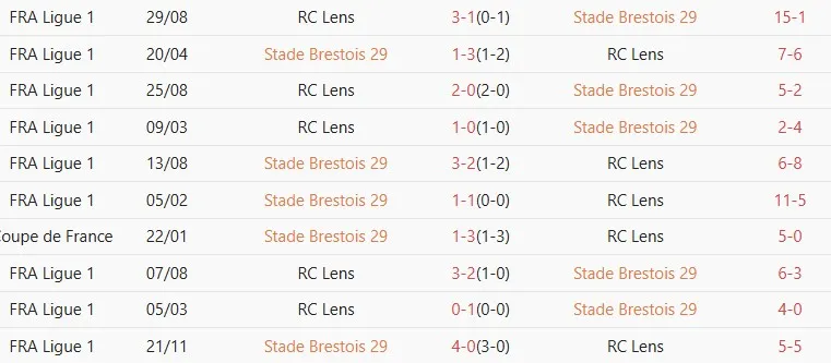 Thống kê phong độ, lịch sử đối đầu của Brest vs Lens