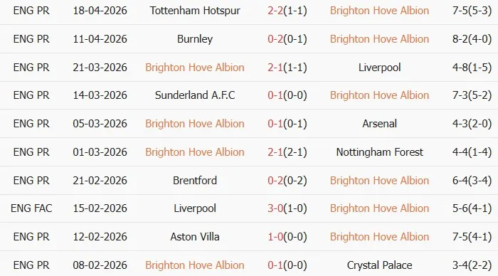 Thống kê phong độ 10 trận đấu gần nhất của Brighton