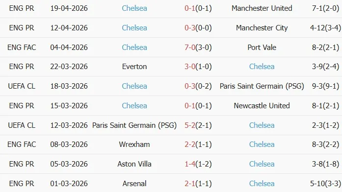 Thống kê phong độ 10 trận đấu gần nhất của Chelsea