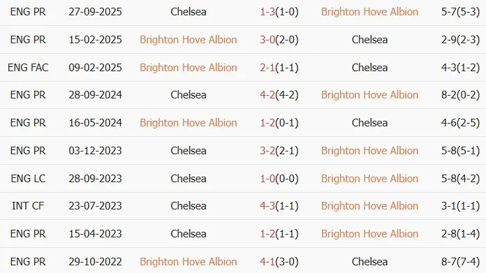 Lịch sử đối đầu Brighton vs Chelsea
