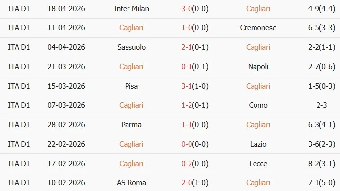 Thống kê phong độ 10 trận đấu gần nhất của Cagliari