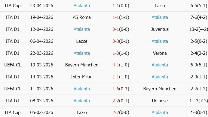 Thống kê phong độ 10 trận đấu gần nhất của Atalanta