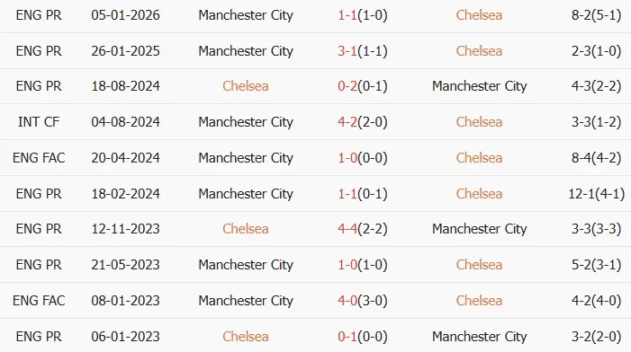Thống kê phong độ, lịch sử đối đầu của Chelsea vs Manchester City
