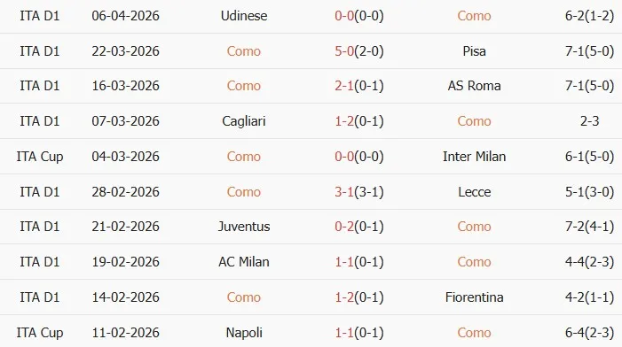 Thống kê phong độ 10 trận đấu gần nhất của Como