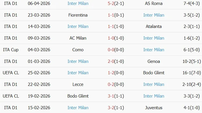 Thống kê phong độ 10 trận đấu gần nhất của Inter Milan