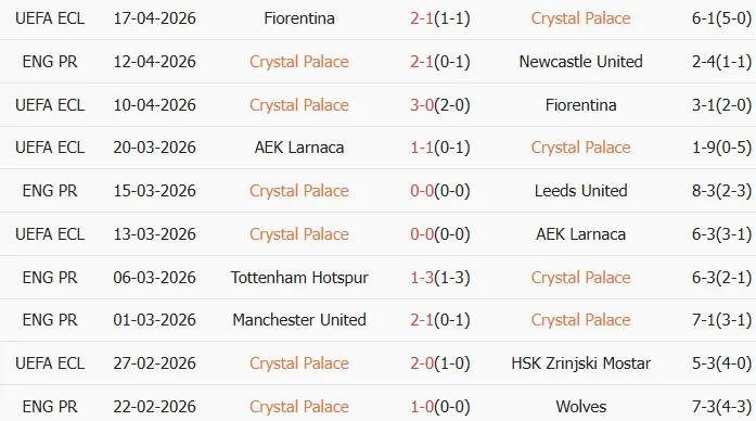 Thống kê phong độ 10 trận đấu gần nhất Crystal Palace