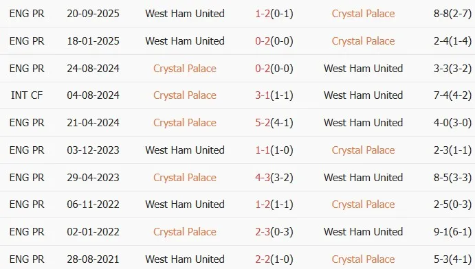 Thống kê phong độ, lịch sử đối đầu của Crystal Palace vs West Ham
