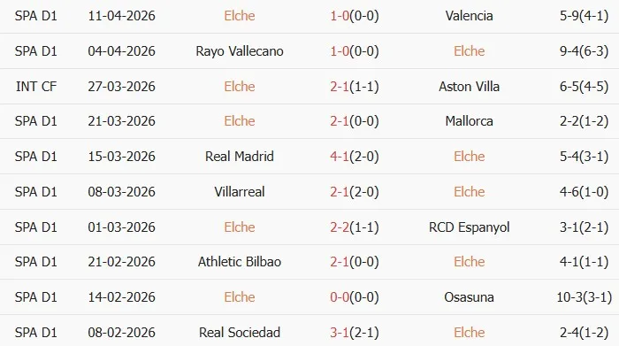 Thống kê phong độ 10 trận đấu gần nhất của Elche