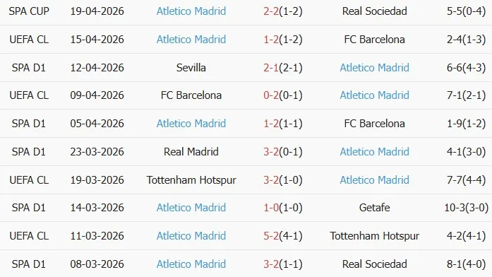 Thống kê phong độ 10 trận đấu gần nhất của Atletico Madrid