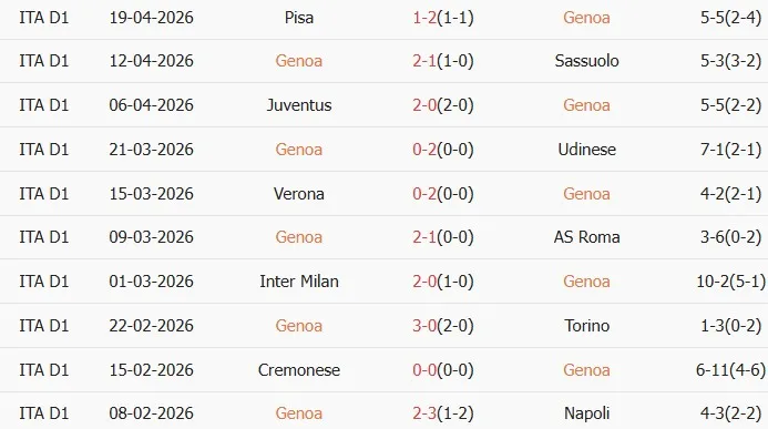 Thống kê phong độ 10 trận đấu gần nhất của Genoa