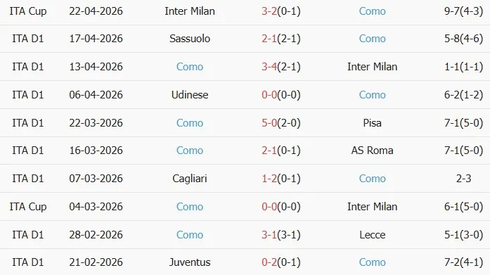 Thống kê phong độ 10 trận đấu gần nhất của Como