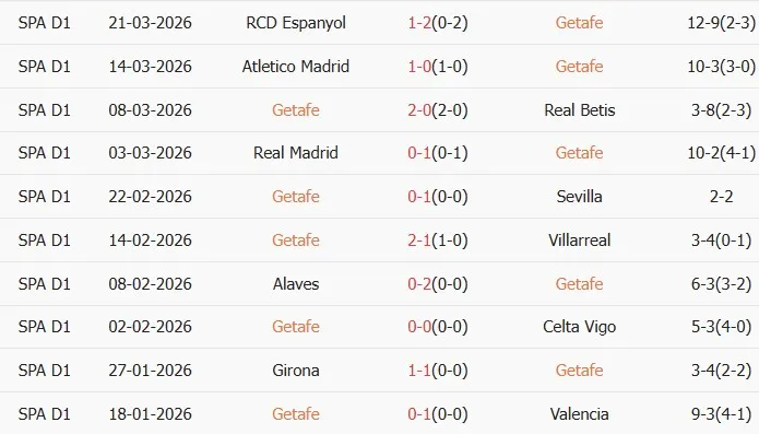 Thống kê phong độ 10 trận đấu gần nhất của Getafe
