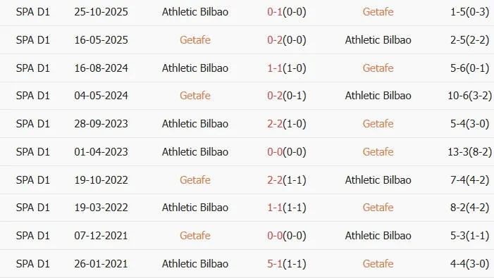 Lịch sử đối đầu Getafe vs Athletic Bilbao