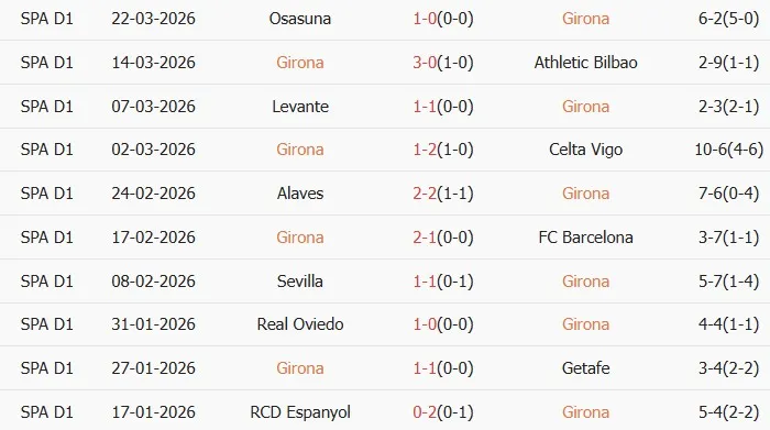 Thống kê phong độ 10 trận đấu gần nhất của Girona