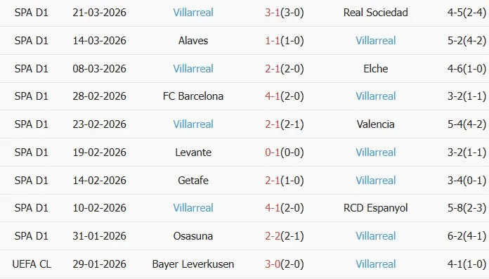 Thống kê phong độ 10 trận đấu gần nhất của Villarreal
