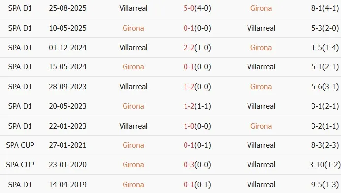 Thống kê phong độ, lịch sử đối đầu của Girona vs Villarreal
