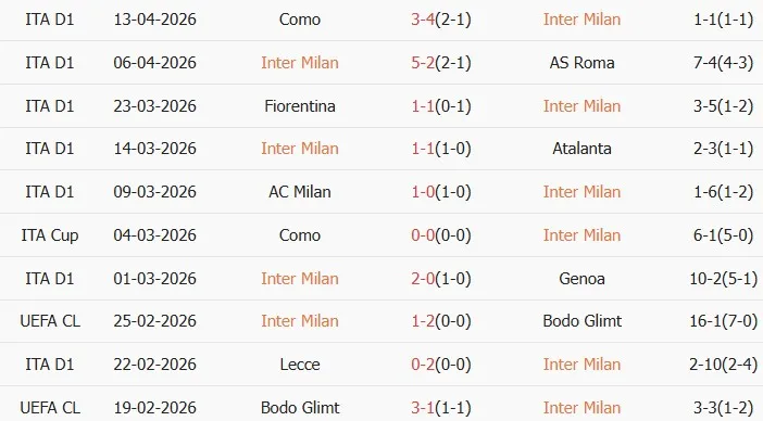 Thống kê phong độ 10 trận đấu gần nhất của Inter Milan