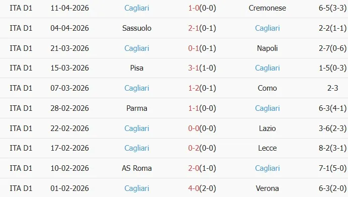 Thống kê phong độ 10 trận đấu gần nhất của Cagliari