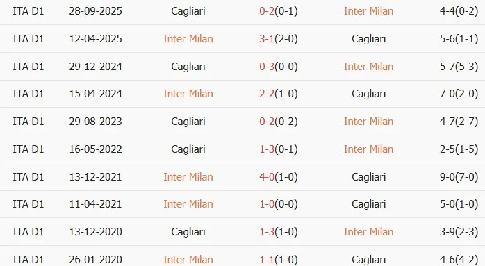 Lịch sử đối đầu Inter Milan vs Cagliari