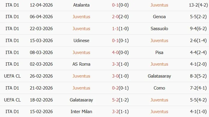 Thống kê phong độ 10 trận đấu gần nhất Juventus